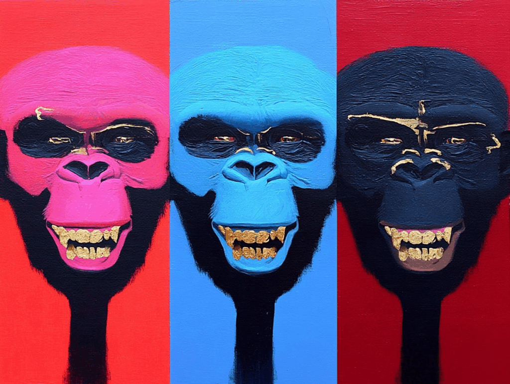 Three simian visages repeat like a chorus line, each rendered in sticky impasto and blockbuster color: magenta on heat, cyan on cool, obsidian on crimson. The mouths flash chipped gold, a grin that reads as triumph and warning, commodity and camouflage. By looping the head three times, the work swaps portraiture for pattern, turning attitude into iconography while the textured paint keeps the surface defiantly feral.