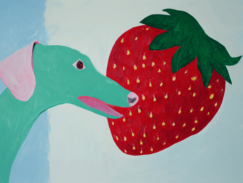 Skittering brushwork lends the mint canine a tender clumsiness, while the strawberry swells into a comic idol, its seeds like lit pixels. The billboard crop turns curiosity into ceremony. Pastel-and-carmine chords keep the mood buoyant, even as the spiral eye hints at appetite’s obsession; sweetness and unease hold a nimble truce.