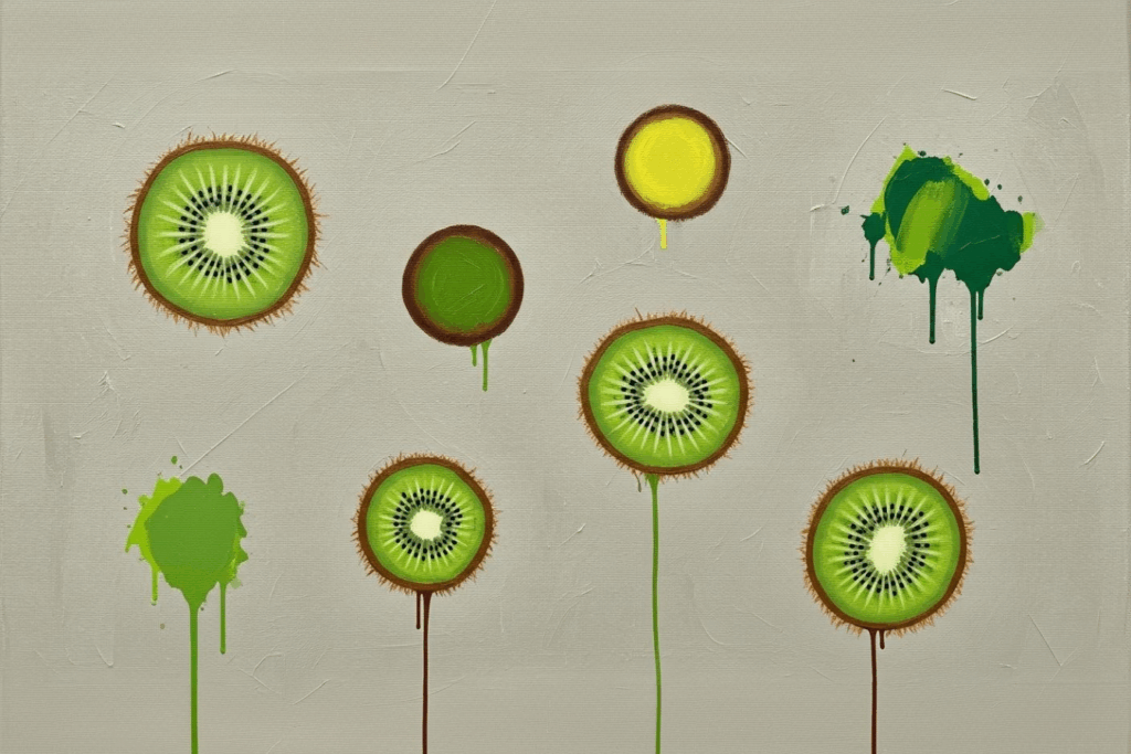 On a cool, textured field, eight circles oscillate between crisp kiwi cross-sections and loose paint. Razor seeds radiate like gears, while drips tug downward, doubling as stems. A lone golden disk and errant splashes disrupt the order, injecting play into the loose array. The work toggles realism and gesture, savoring pulp and pigment alike, letting acid greens hum against the quiet ground.
