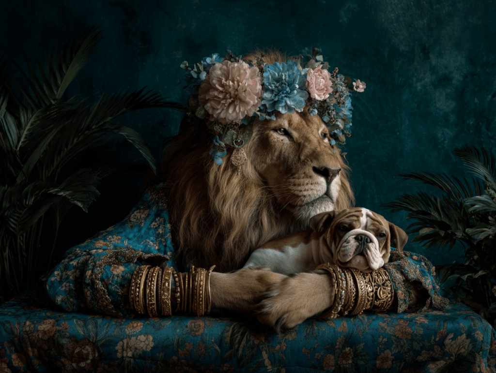 Bathed in painterly teal, this staged duet trades ferocity for ceremony. The lion’s brocade and bracelets turn apex strength into courtly ritual, while the bulldog’s pleated face punctures grandeur with droll softness. Diagonal paws lock the tableau, and the wreath’s peonies temper the mane’s wild charge. The result is myth-meets-parlor: authority hushed, tenderness crowned, a witty meditation on protection recast as luxurious repose.