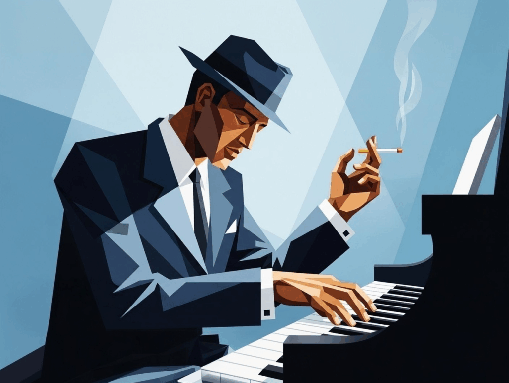 Hard-edged planes slice a cool palette of blues and charcoals, framing a poised figure at the piano. A fedora tilts, fingers splay over ivory, while a cigarette threads a thin ribbon of smoke through stage-bright triangles. Stylized facets translate sound into architecture, tempo into light and shadow. Elegance meets grit in a quiet crescendo, where restraint keeps the rhythm long after the last note fades.