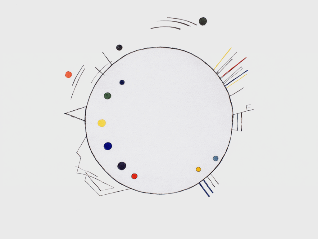 Minimal lines and punctuated primaries sketch a planetary score, the blank interior acting like sustained rest. Tension pools at the rim—dots as notes, ticks as timestamps, stray angles as marginalia. Delicate ink wobbles humanize the geometry, and the right-side flare nudges the circle toward motion.