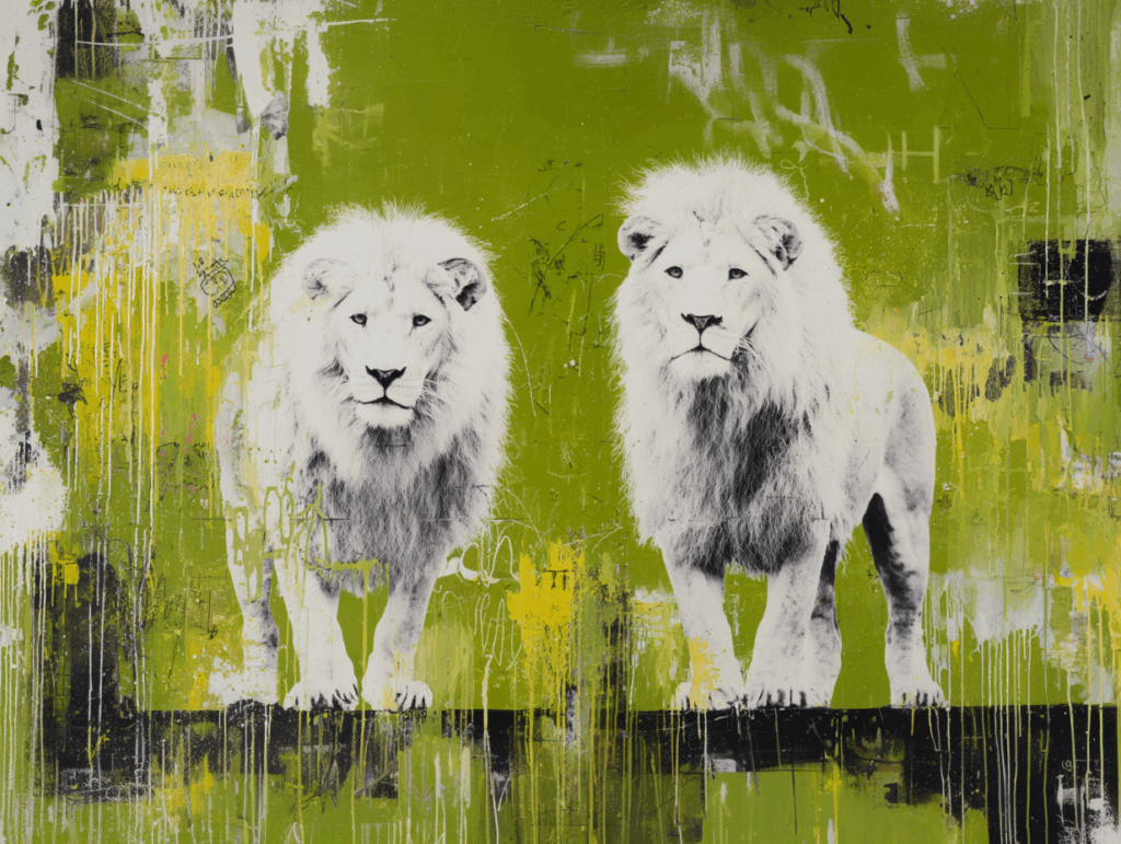 Two pale lions stride forward across a dark ledge, rendered in stark monochrome against a riot of acid green drips, scratches, and ghosted tags. The regal calm of their gaze collides with urban abrasion, turning the canvas into a stage where wilderness and street code meet. Texture carries the growl; negative space sharpens the stance. A fierce duet, poised between surveillance and myth.