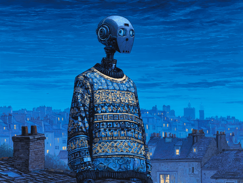 A lone android looms above worn roofs, swaddled in an ornate knit that reads like circuitry made soft. Cobalt night saturates the scene while scattered windows pulse with human warmth. The contrast between mechanical neck and handcrafted pattern turns introspection into spectacle, asking where care resides in a manufactured body. Clean lines and patient blues deliver a quiet, cinematic melancholy that lingers.