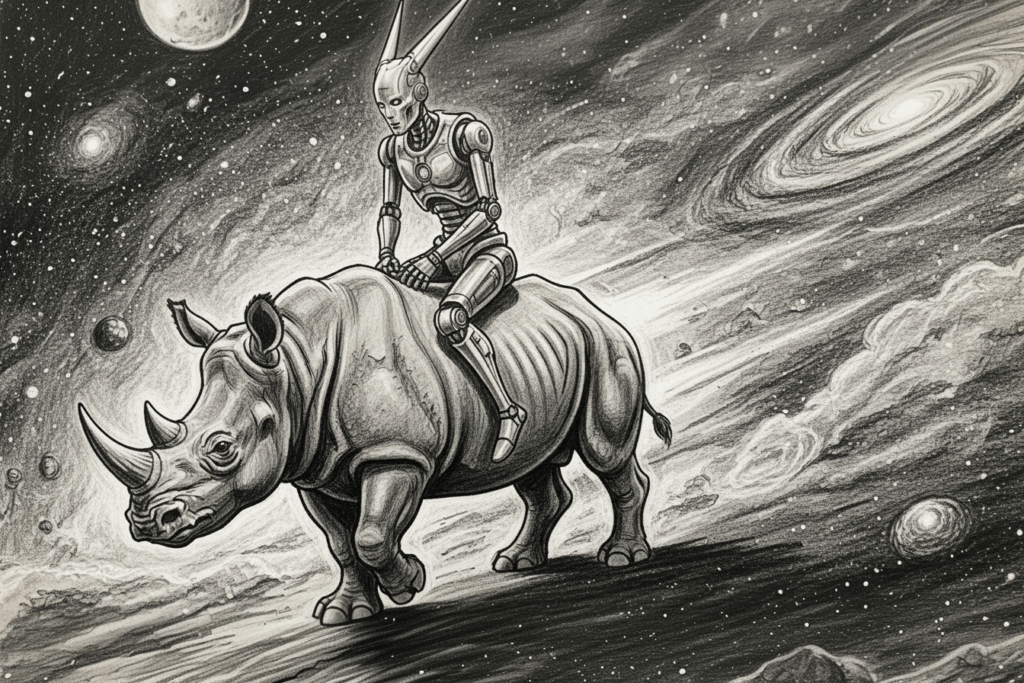 Graphite lines stage a surreal pairing: a horned colossus bearing a sleek, rabbit-antennaed automaton across a star-thick cosmos. Crosshatching sculpts creased hide and plated joints while spiral galaxies read as waypoints. The gait feels ceremonial, a pilgrimage of mass through vacuum. Organic heft and engineered poise trade authority, turning expedition into an allegory of endurance and lucid wonder.