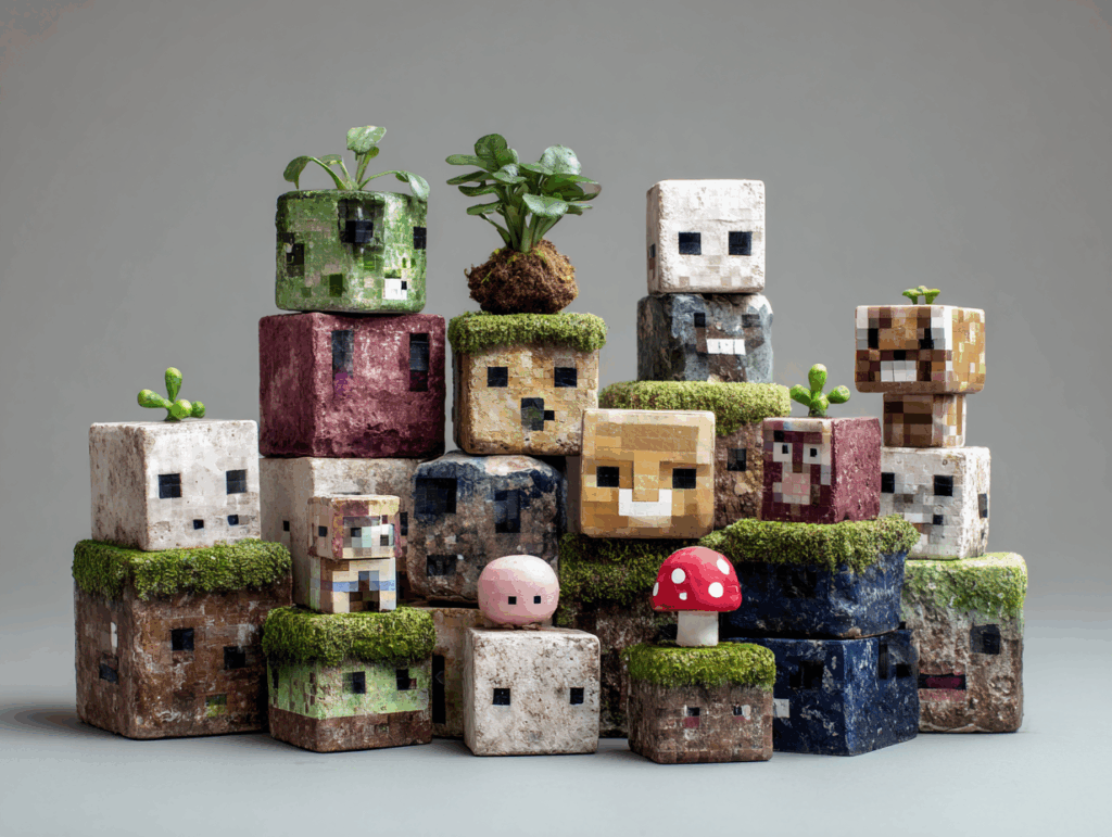 Stacked like a gentle ziggurat, these weathered cubes wear pixel faces and flecks of moss, some crowned with seedlings and a lone red mushroom. The blend of rough, earthen textures and low-res geometry teases between nature and interface, toy and relic. Each block performs a mood—aloof, cheerful, weary—while the plants offer a slow, living punchline. The composition is crisp, the palette muted, letting tiny eyes and sprouts do the talking.